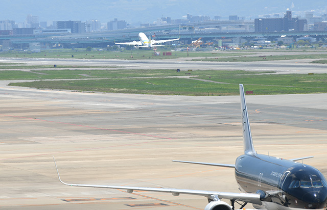 福岡空港で離陸を待つエア・ドゥの札幌行きHD113便初便(下)と着陸するソラシドエアの到着便=22年7月1日 PHOTO: Yusuke KOHASE/Aviation Wire