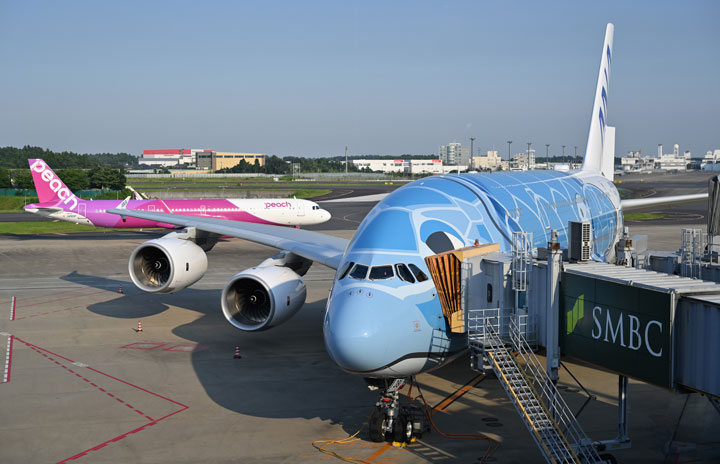 成田空港で出発を待つANAのA380初号機とピーチのA321LR=22年7月1日 PHOTO: Tadayuki YOSHIKAWA/Aviation Wire