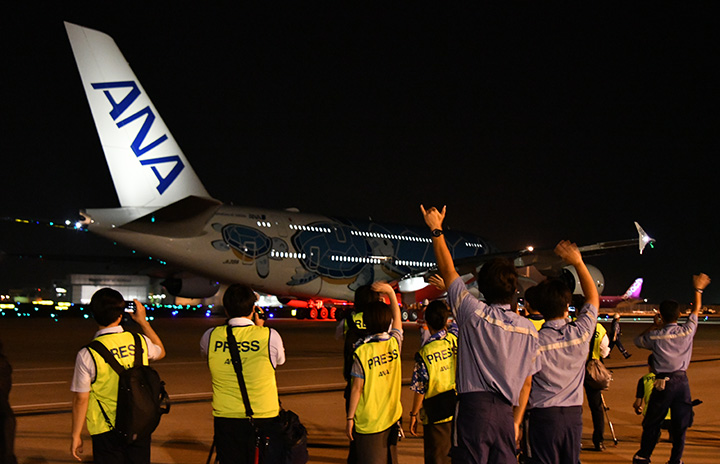 成田空港でA380再開初便となったホノルル行きNH184便を見送るANAのスタッフ=22年7月1日 PHOTO: Yusuke KOHASE/Aviation Wire