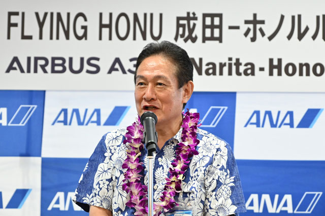 成田空港でA380再開初便出発前にあいさつするANAの井上慎一社長=22年7月1日 PHOTO: Tadayuki YOSHIKAWA/Aviation Wire