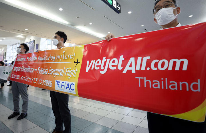 タイ・ベトジェットエアのバンコク発福岡行き初便VZ810便の乗客を横断幕を掲げて歓迎する福岡国際空港(FIAC)のスタッフ=22年7月16日 PHOTO: Kiyoshi OTA/Aviation Wire