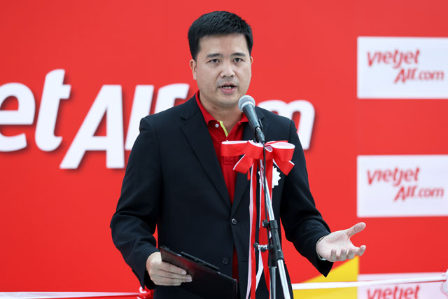福岡空港で開かれた就航式典で挨拶するタイ・ベトジェットエアのルォン・シュアン・アン副社長=22年7月16日 PHOTO: Kiyoshi OTA/Aviation Wire