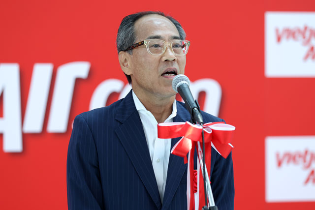 福岡空港で開かれた就航式典で挨拶する福岡市の光山裕朗副市長=22年7月16日 PHOTO: Kiyoshi OTA/Aviation Wire