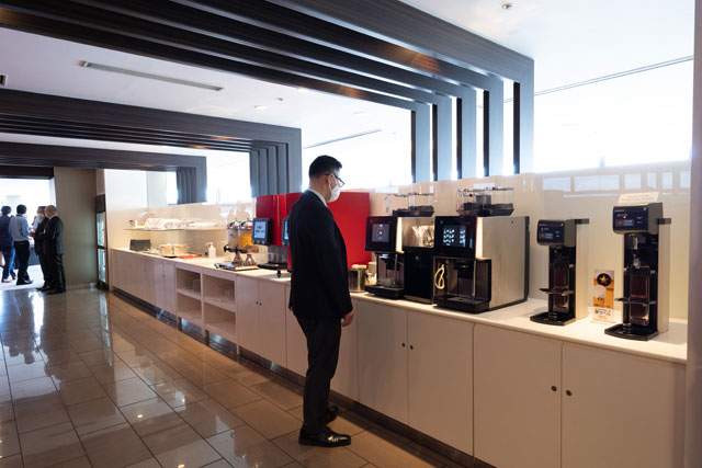 スイスポートが成田にオープンするASPIREラウンジのドリンクコーナー=22年7月28日 PHOTO: Tatsuyuki TAYAMA/Aviation Wire
