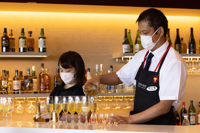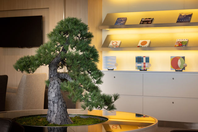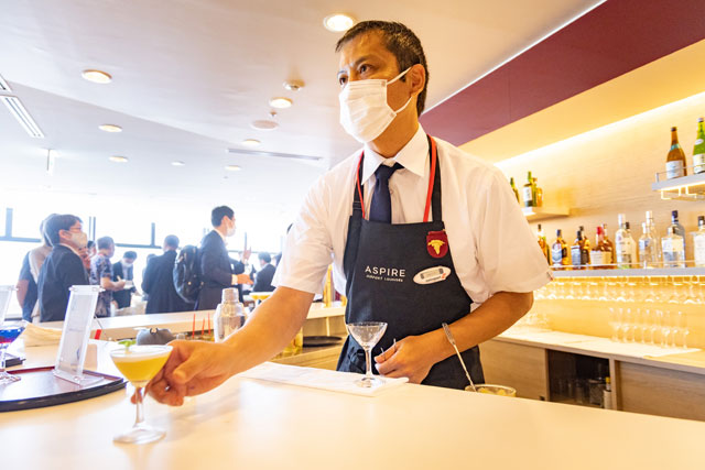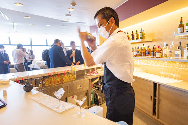 飲み物はソフトドリンクやワイン、ビールをそろえ、他社ラウンジよりも広めにしたというバーでは、日本の「和」をイメージした四季折々のカクテルを提供。ビュッフェでも日本を感じられるメニューを用意する。ケータリングは、成田などで機内食を手掛けるゲートグルメジャパンが受託する。