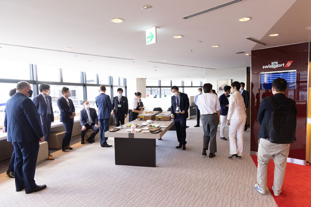 スイスポートが成田にオープンするASPIREラウンジのレセプション=22年7月28日 PHOTO: Tatsuyuki TAYAMA/Aviation Wire