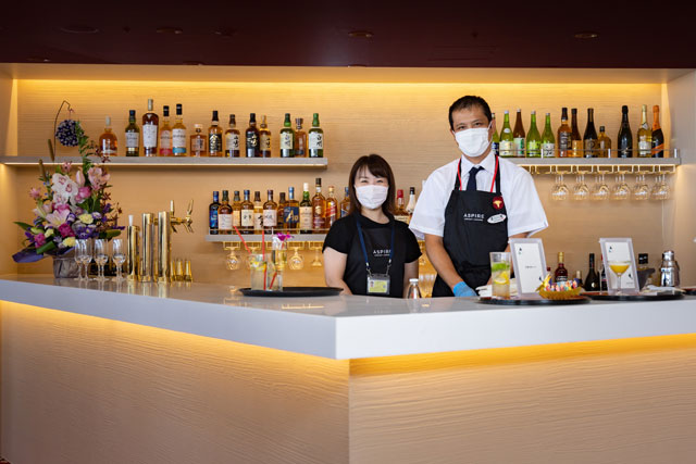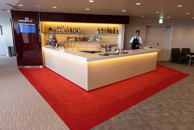 スイスポートが成田にオープンするASPIREラウンジのバーコーナー=22年7月28日 PHOTO: Tatsuyuki TAYAMA/Aviation Wire