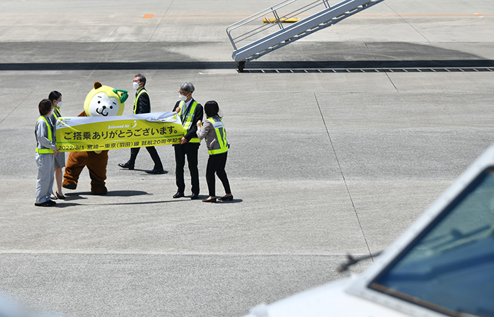 宮崎空港で羽田行き6J58便を横断幕で見送るソラシドエアの髙橋社長(右から2人目)ら=22年8月1日 PHOTO: Yusuke KOHASE/Aviation Wire