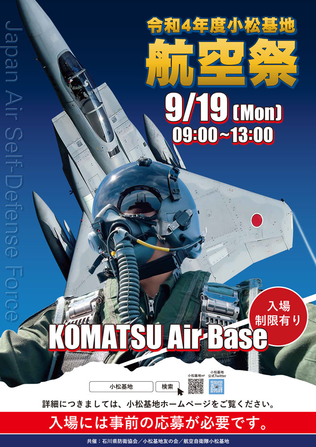 小松基地の航空祭は、9月19日開催予定。新型コロナウイルス感染症(COVID-19)の影響を受けて2年連続で中止となり、今回は3年ぶり。基地所属のF-15やU-125A、UH-60Jのほか、ブルーインパルスも飛来する。時間は午前9時から午後1時まで。