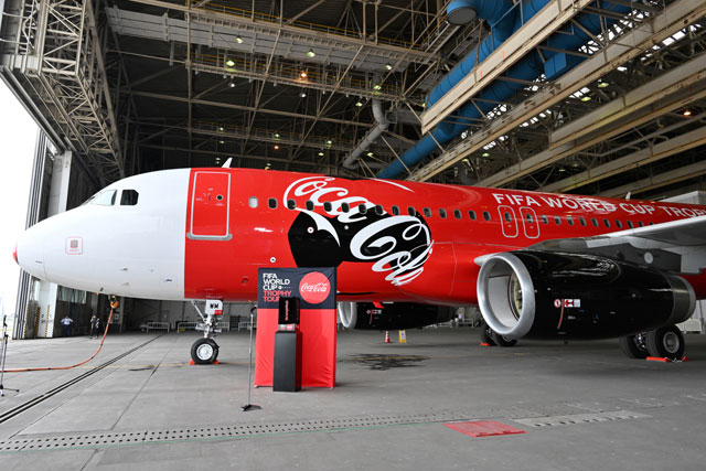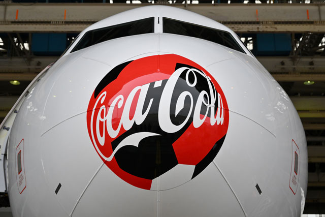 機首にコカ・コーラのロゴが描かれたW杯トロフィーツアー特別塗装機=22年8月26日 PHOTO: Tadayuki YOSHIKAWA/Aviation Wire