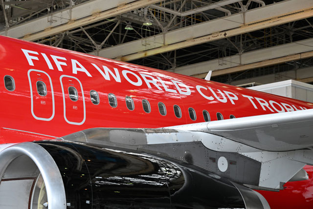 11月に開催されるサッカー・ワールドカップ(W杯)のトロフィーを載せた特別塗装機(エアバスA320型機、登録記号G-POWM)が8月28日、羽田空港を出発し次の目的地であるフィリピンのマニラへ到着した。