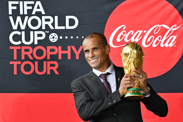 羽田空港でW杯トロフィーを手にする元ブラジル代表のリバウド氏=22年8月26日 PHOTO: Tadayuki YOSHIKAWA/Aviation Wire