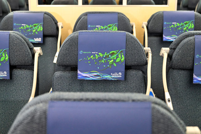 リンゴジュースの絞りかすを活用した「RINGO-TEX」を使ったANAグリーンジェットのプレミアムクラスのヘッドレストカバー=22年10月3日 PHOTO: Tadayuki YOSHIKAWA/Aviation Wire