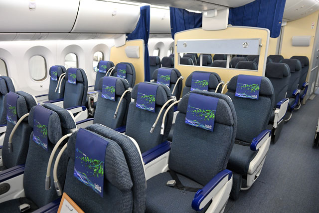 リンゴジュースの絞りかすを活用した「RINGO-TEX」を使ったANAグリーンジェットのプレミアムクラスのヘッドレストカバー=22年10月3日 PHOTO: Tadayuki YOSHIKAWA/Aviation Wire