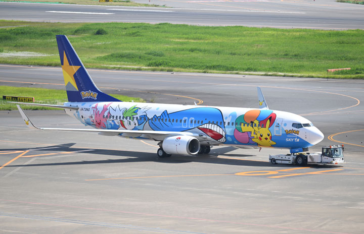羽田空港のスポットへトーイングカーで牽引されるスカイマークの「ピカチュウジェットBC」2号機=22年5月30日 PHOTO: Tadayuki YOSHIKAWA/Aviation Wire