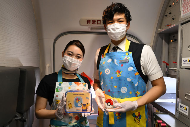 スカイマークの「ピカチュウジェットBC」2号機初便那覇行きBC519便でエプロンを着用して機内販売品を手にする客室乗務員=22年5月30日 PHOTO: Tadayuki YOSHIKAWA/Aviation Wire
