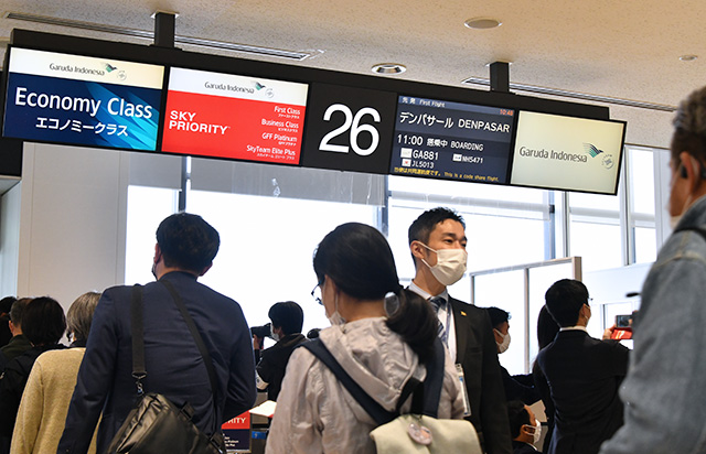 成田空港でガルーダ・インドネシア航空のデンパサール行きGA881便再開初便に搭乗する利用客=22年11月1日 PHOTO: Yusuke KOHASE/Aviation Wire