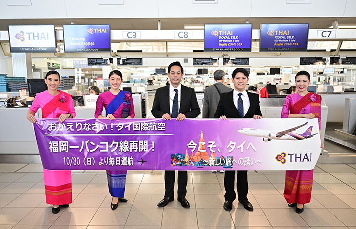 福岡線再開を記念した横断幕を手にするタイ国際航空の旅客営業部門マネージャー(中央、右から2人目)と客室乗務員=22年10月30日 PHOTO: Daigo TAKENOBU/Thai Airways International