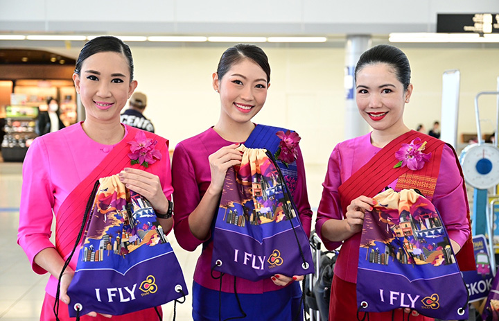福岡線再開の記念品を手にするタイ国際航空の客室乗務員=22年10月30日 PHOTO: Daigo TAKENOBU/Thai Airways International