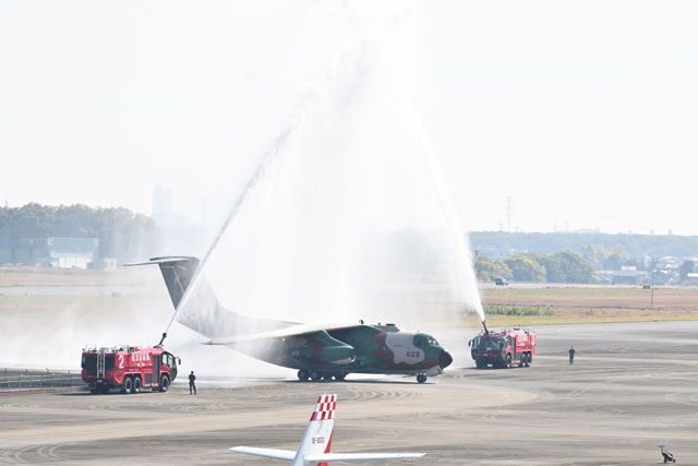 入間航空祭の展示飛行がラストフライトになり放水アーチの歓迎を受けるC-1の29号機=22年11月3日 PHOTO: Tadayuki YOSHIKAWA/Aviation Wire