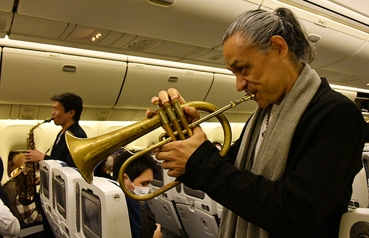 ANAの皆既月食チャーター便NH2022便の出発前に機内でジャズを披露するミュージシャン=22年11月8日 PHOTO: Yusuke KOHASE/Aviation Wire