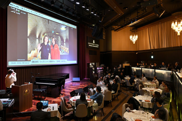 4つのワイナリーが参加し、仁木町からはNIKI Hillsワイナリーとル・レーヴ・ワイナリー、余市町からドメーヌ・タカヒコとキャメルファーム・ワイナリーのワインがそろった。通常はソムリエが料理に合うワインを提案するが、イベントで紹介するワインに合うメニューを、同レストランの支配人でソムリエの長谷川純一さんがシェフとともに考案した。また、レストラン前方の大型スクリーンにワイナリーの様子をライブ中継で映し出し、参加者が現地のスタッフに質問する時間も設けられた。