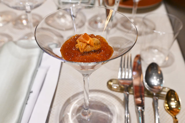 冷前菜「ウニとオマール海老のコンソメゼリー、カリフラワー・ムースのカクテル」=22年11月23日 PHOTO: Tadayuki YOSHIKAWA/Aviation Wire