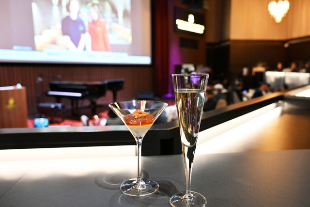 俺のフレンチ グランメゾン 大手町で開かれた「旅するメーカーズディナー」で提供された冷前菜「ウニとオマール海老のコンソメゼリー、カリフラワー・ムースのカクテル」(左)と「HATSUYUKI スパークリング 2020」=22年11月23日 PHOTO: Tadayuki YOSHIKAWA/Aviation Wire