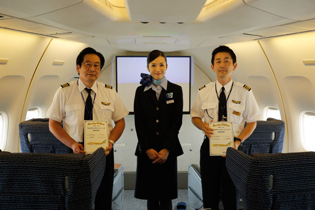 搭乗証明書を手にする西野機長(左)ら=9月30日 PHOTO: Tatsuyuki TAYAMA/Aviation Wire
