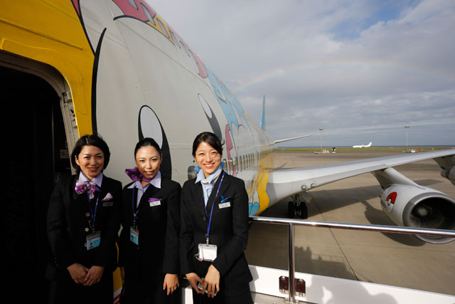 虹をバックに撮影に応じるNH126便の客室乗務員ら=9月30日 PHOTO: Tatsuyuki TAYAMA/Aviation Wire