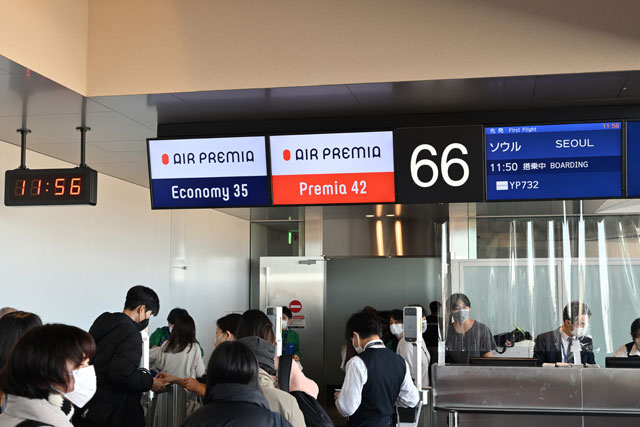 成田空港の66番搭乗口に並ぶエアプレミアのソウル行き初便YP732便の乗客=22年12月23日 PHOTO: Tadayuki YOSHIKAWA/Aviation Wire