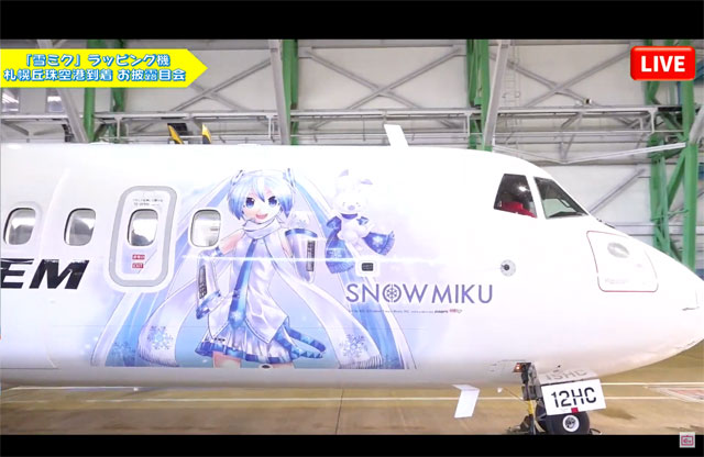 丘珠空港に到着した「雪ミク」を描いたHACのラッピング機(ピアプロTVのライブ配信から)
