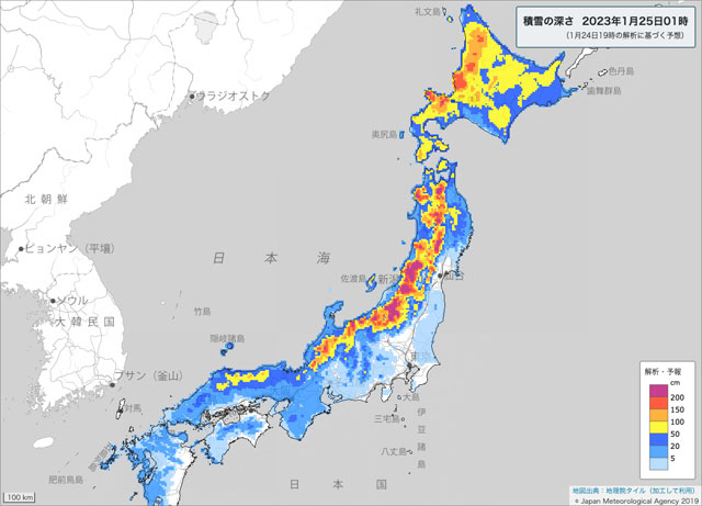 気象庁によると、日本付近は1月26日にかけて強い冬型の気圧配置となるため、北日本から西日本の日本海側では大雪となり、太平洋側の平地でも大雪となる所がある見込み。24日午後7時時点で、日本航空(JAL/JL、9201)と全日本空輸(ANA/NH)の大手2社だけで25日は国内線197便の欠航が決定。約8700人に影響が出る見込み。
