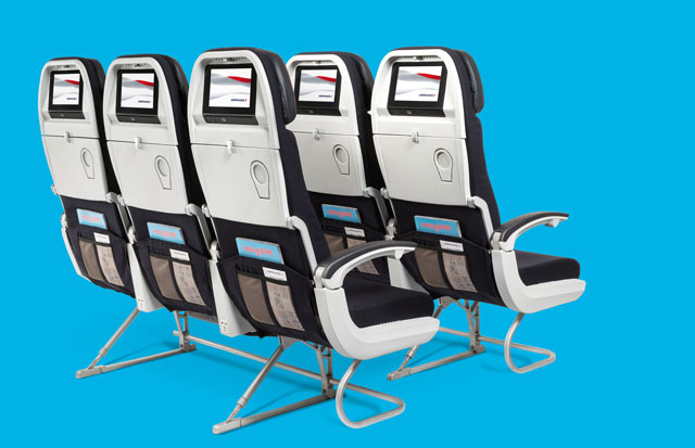 エコノミークラスの新シートは、足元を広くし、調節可能なヘッドレストや広いテーブルを装備。各席には電源とヘッドフォンホルダーなどが加わる。