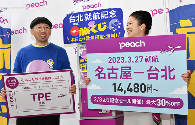 名古屋駅近くで開催したイベント「押売り旅くじ」で中部-台北線の就航を発表するピーチの客室乗務員(右)とスタッフ=23年2月1日 PHOTO: Yusuke KOHASE/Aviation Wire