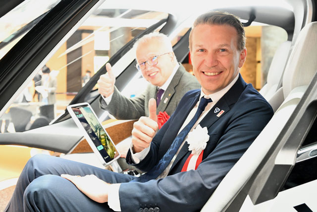 大阪市内で山口信彦大阪府副知事(右)とともにeVTOL「VoloCity」のモックアップを披露するヴォロコプターのクリスチャン・バウアー代表=23年3月8日 PHOTO: Tadayuki YOSHIKAWA/Aviation Wire