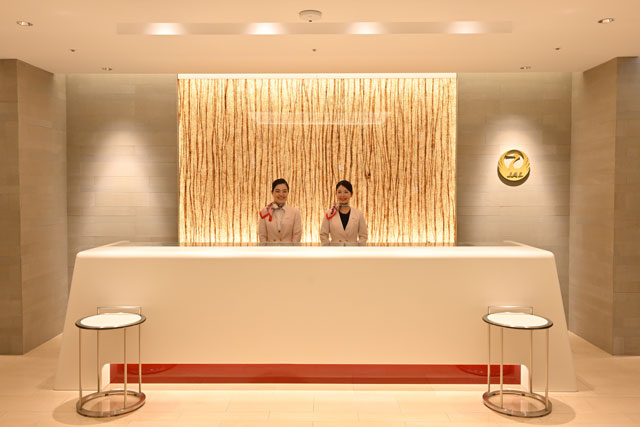 JALの羽田空港国際線新サクララウンジのエントランスで出迎えるスタッフ=23年3月24日 PHOTO: Tadayuki YOSHIKAWA/Aviation Wire