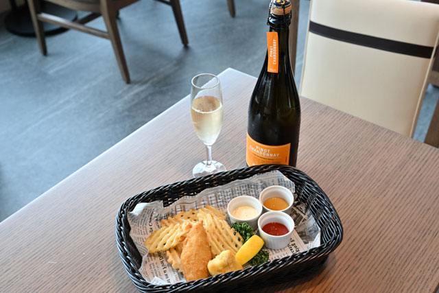 JALの羽田空港国際線新サクララウンジで提供するシャンパンとフィッシュ&チップス=23年3月24日 PHOTO: Tadayuki YOSHIKAWA/Aviation Wire