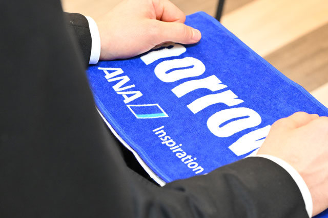 羽田空港近くの総合訓練施設「ANA Blue Base」で開かれたANAグループの入社式で恒例の青いタオルを手にする新入社員=23年4月1日 PHOTO: Tadayuki YOSHIKAWA/Aviation Wire