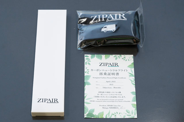 ZIPAIRのカーボンニュートラルフライト初便ホノルル行きZG2便の乗客に手渡された記念品=23年4月1日 PHOTO: Takayuki MURATA/Aviation Wire