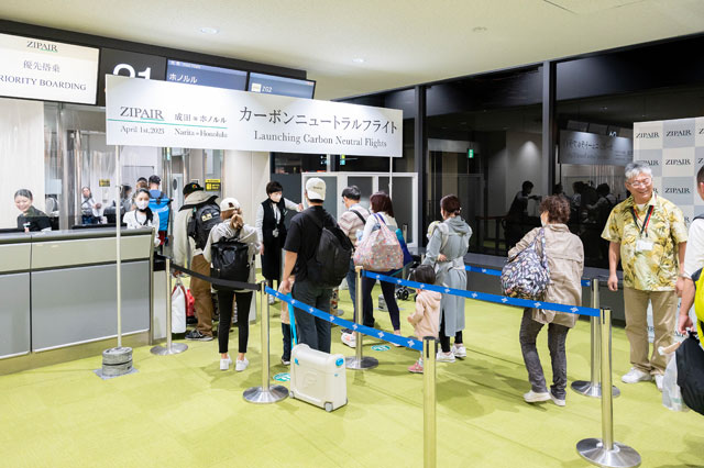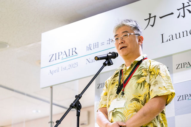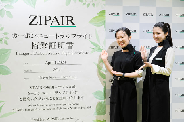 出発前の記念式典で、ZIPAIRの西田真吾社長は「成田―ホノルル線で持続可能な航空燃料の使用、排出量と同等の二酸化炭素を吸収する活動への協賛を通じてカーボンニュートラルの定期便を実現できた。アジアの小さな航空会社ではあるが、小さいからこそ出来ることがある。カーボンニュートラルの実現、これを我々のDNAに刻みつけたい」と語った。同路線のカーボンニュートラル化に当たっては、SAFの使用に加えて、排出権取引制度も活用した。