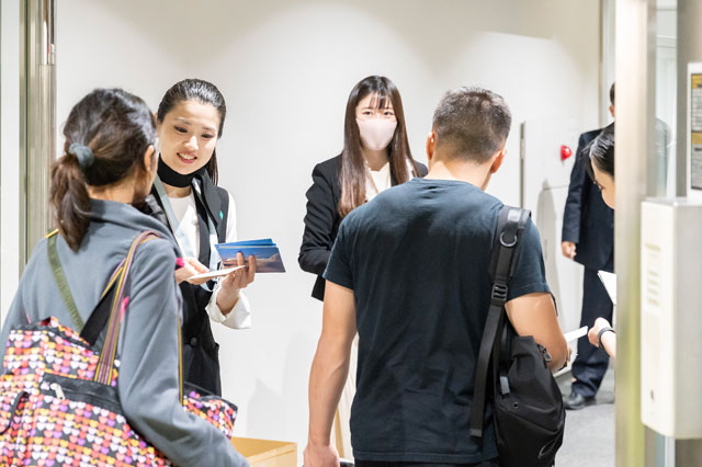 成田空港でカーボンニュートラルフライト初便ホノルル行きZG2便の乗客を記念品を手渡すZIPAIRのスタッフ=23年4月1日 PHOTO: Takayuki MURATA/Aviation Wire