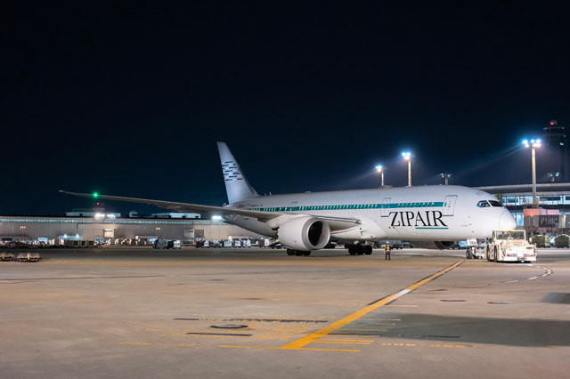成田空港で出発を待つZIPAIRのカーボンニュートラルフライト初便ホノルル行きZG2便=23年4月1日 PHOTO: Takayuki MURATA/Aviation Wire