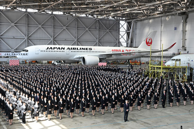A350-900 JA01XJが駐機された羽田空港の格納庫で開かれたJALグループの入社式で新入社員と並ぶJALの赤坂社長=23年4月3日 PHOTO: Tadayuki YOSHIKAWA/Aviation Wire