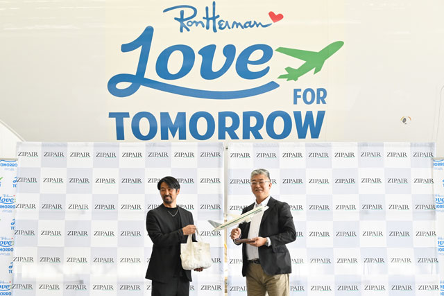 Ron Hermanとのコラボレーションロゴを描いたZIPAIRの特別塗装機JA850Jの前で提携を発表するZIPAIRの西田真吾社長(右)とサザビーリーグの三根弘毅リトルリーグカンパニー プレジデント=23年4月13日 PHOTO: Tadayuki YOSHIKAWA/Aviation Wire