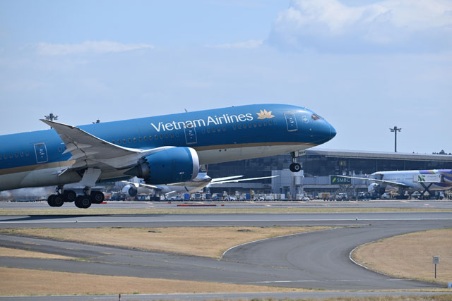 スカイバスから見た成田空港を離陸するベトナム航空の787=23年3月20日 PHOTO: Tadayuki YOSHIKAWA/Aviation Wire