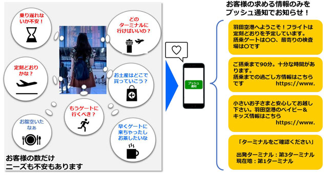フライトを登録する際、旅行目的がレジャーなのか出張なのかなどを選択し、羽田で出発するまでにどのように過ごすのかを登録すると、搭乗口や搭乗開始時刻までの過ごし方をアプリの「プッシュ通知」で知らせる。