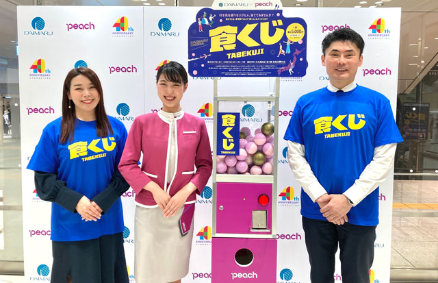 ピーチ・アビエーション(APJ/MM)は4月27日、大丸梅田店と「食」をテーマにした「食くじ(たべくじ)」の販売を始めた。開店40周年記念で、ピーチの就航地にちなんだグルメの引換券が入ったカプセルを店舗に設置した自販機で販売している。