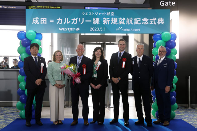 成田空港で開かれた就航記念式典に出席するウエストジェットのチャールズ・クラウダー販売開発副社長、バンフ国立公園のレズリー・ブルースCEO=23年5月1日 PHOTO: Kiyoshi OTA/Aviation Wire