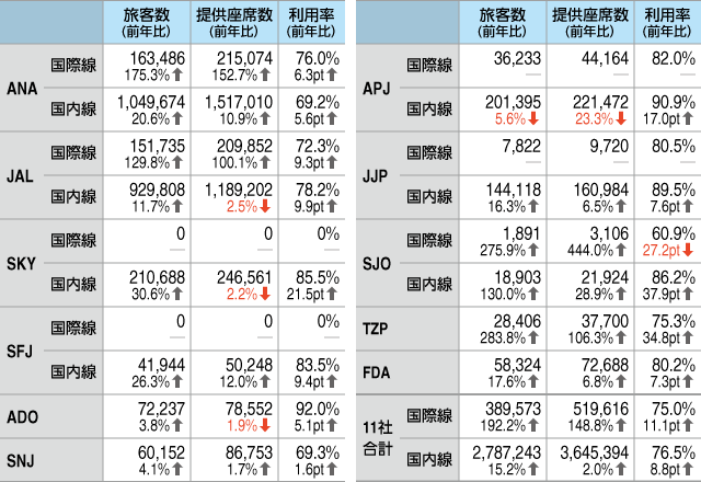 11社の発表値を合計すると、旅客数は国際線が3倍近い前年同期比2.92倍の38万9573人、国内線は15.2%増の278万7243人。提供座席数は国際線が2.48倍の51万9616席で、国内線は2.0%増の364万5394席だった。11社平均のロードファクター(座席利用率、L/F)は国際線が11.1ポイント上昇し75.0%、国内線は8.8ポイント上昇し76.5%だった。
